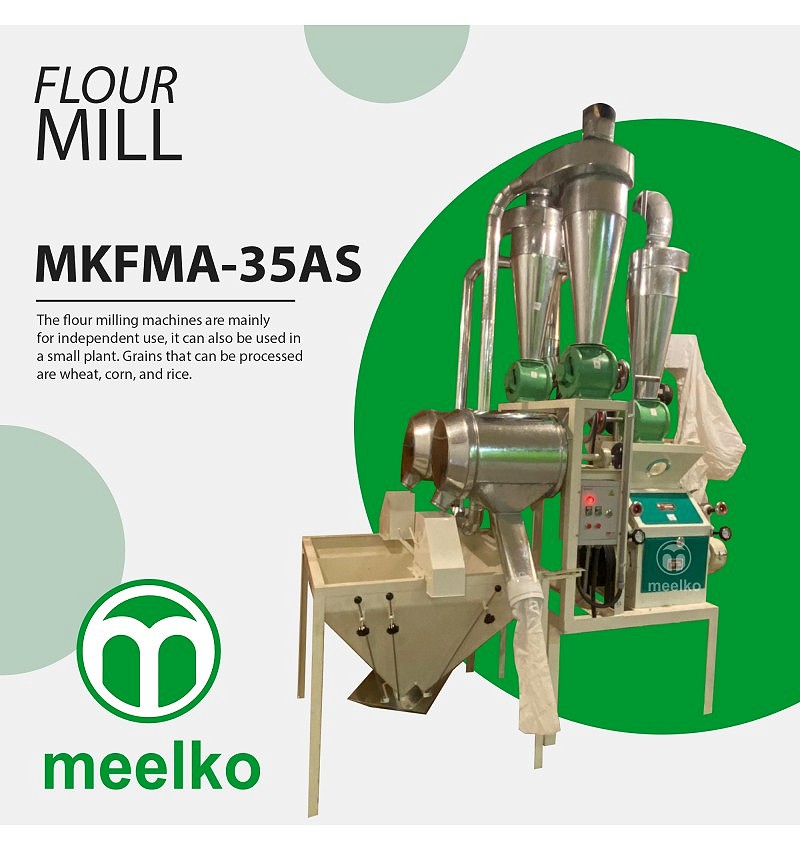 Molino de harina MKFMA-35AS semiautomático con capacidad de 130–175 kg/h, ideal para uso independiente o en pequeñas plantas. Procesa trigo, maíz y arroz con operación eficiente y diseño robusto.